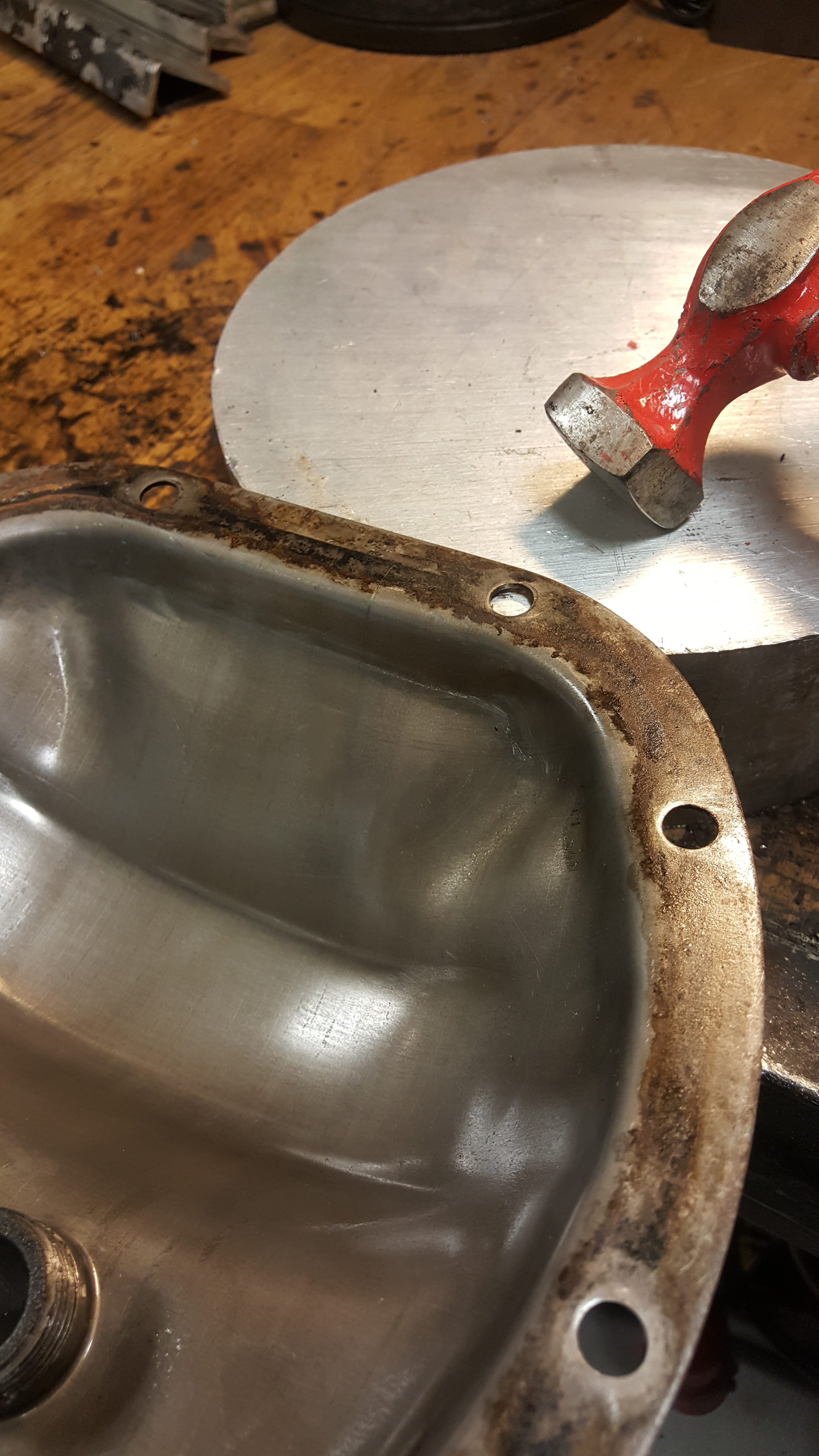 Vid byte av bakaxelolja demonteras locket så att man kan rengöra botten av huset.  Då locket är tillverkat i plåt så måste skruvhålen riktas då de har blivit dragna för hårt vid något tidigare tillfälle.