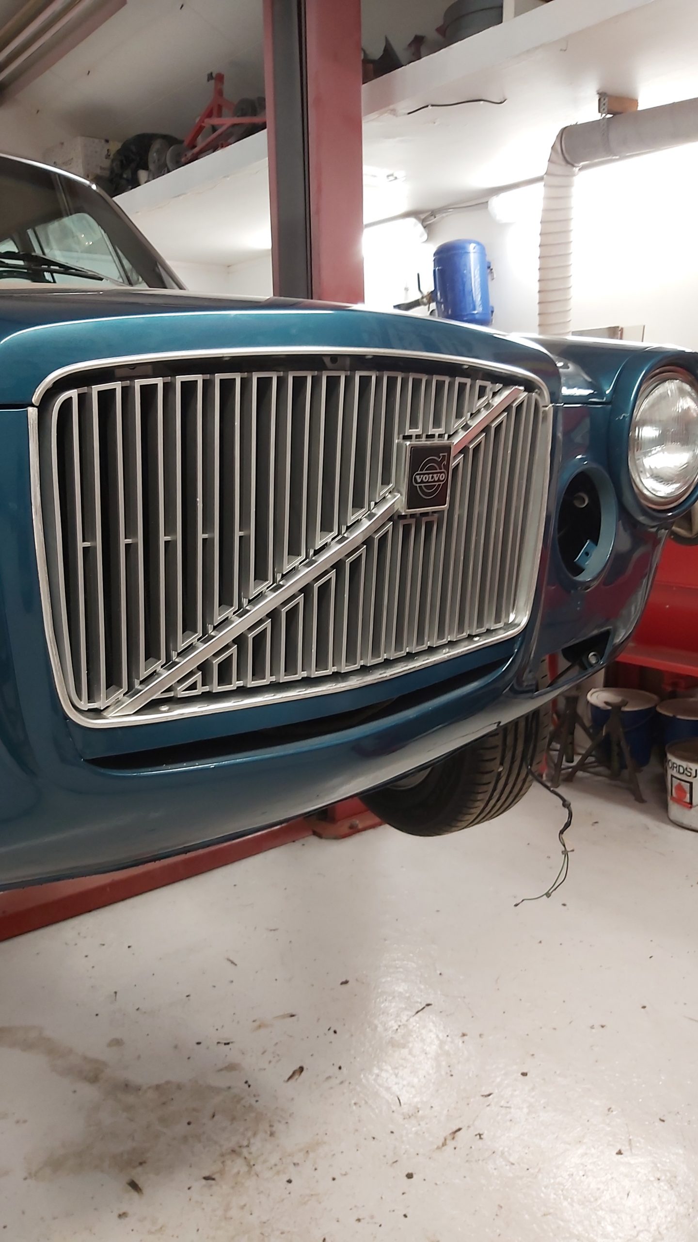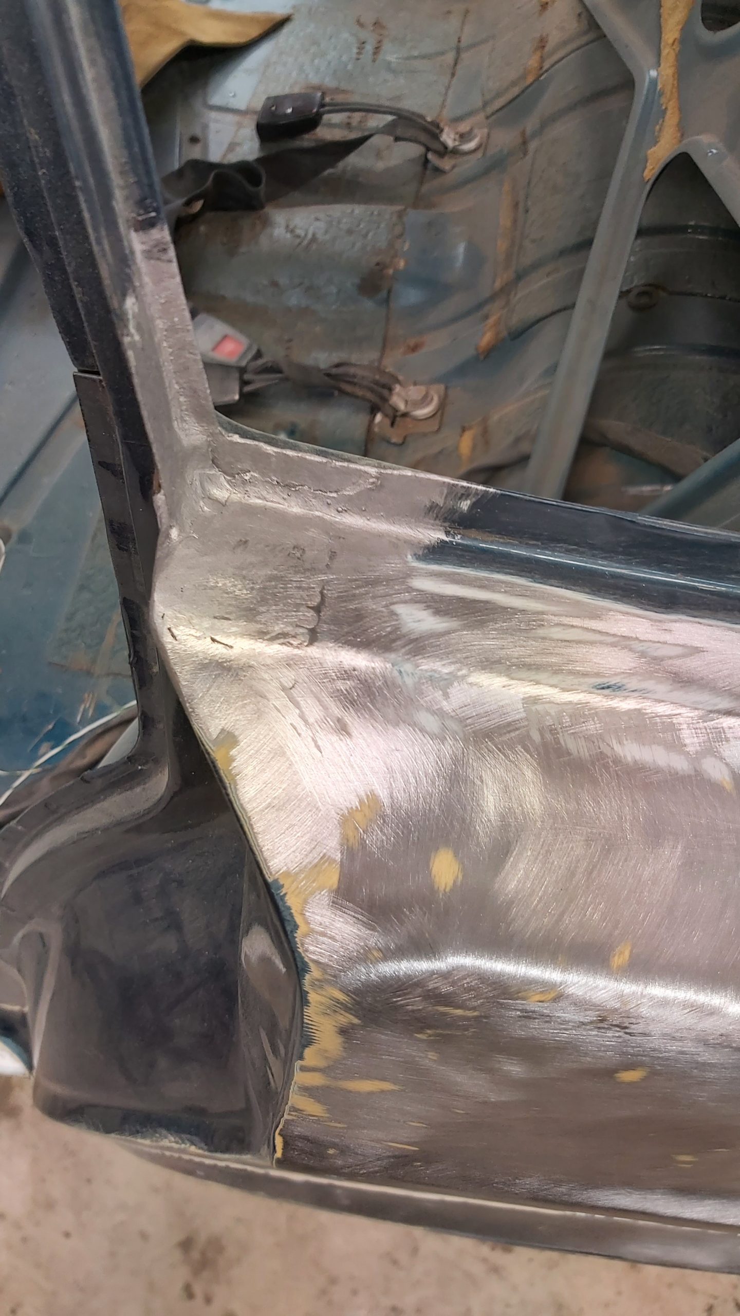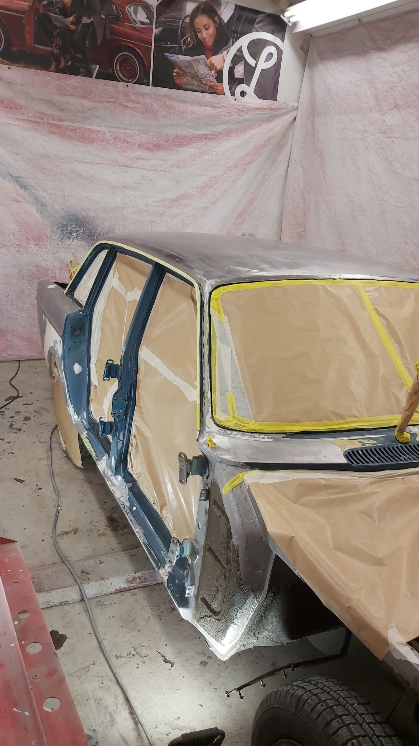 Upptäcker att denna bilen har varit plåtren och omlackad vid ett tidigare tillfälle för många år sedan. Tyckte att det var konstigt att det låg tjock gul grundfärg (sprutspackel) närmast plåten då Volvo använde grå primer. Med det visade sig bla under de limmade blanklisterna på dörrarna där den gamla primern fanns kvar där.