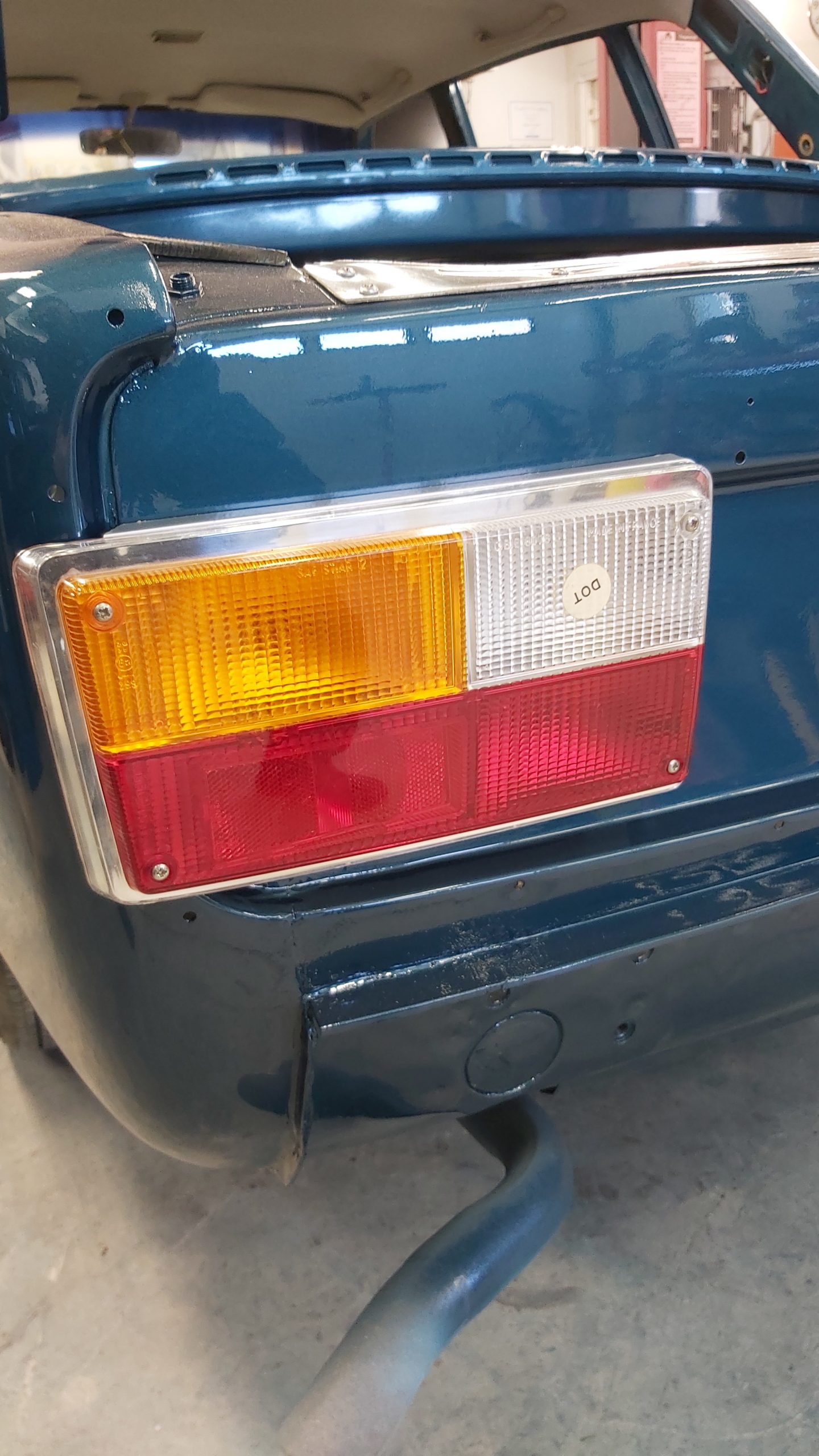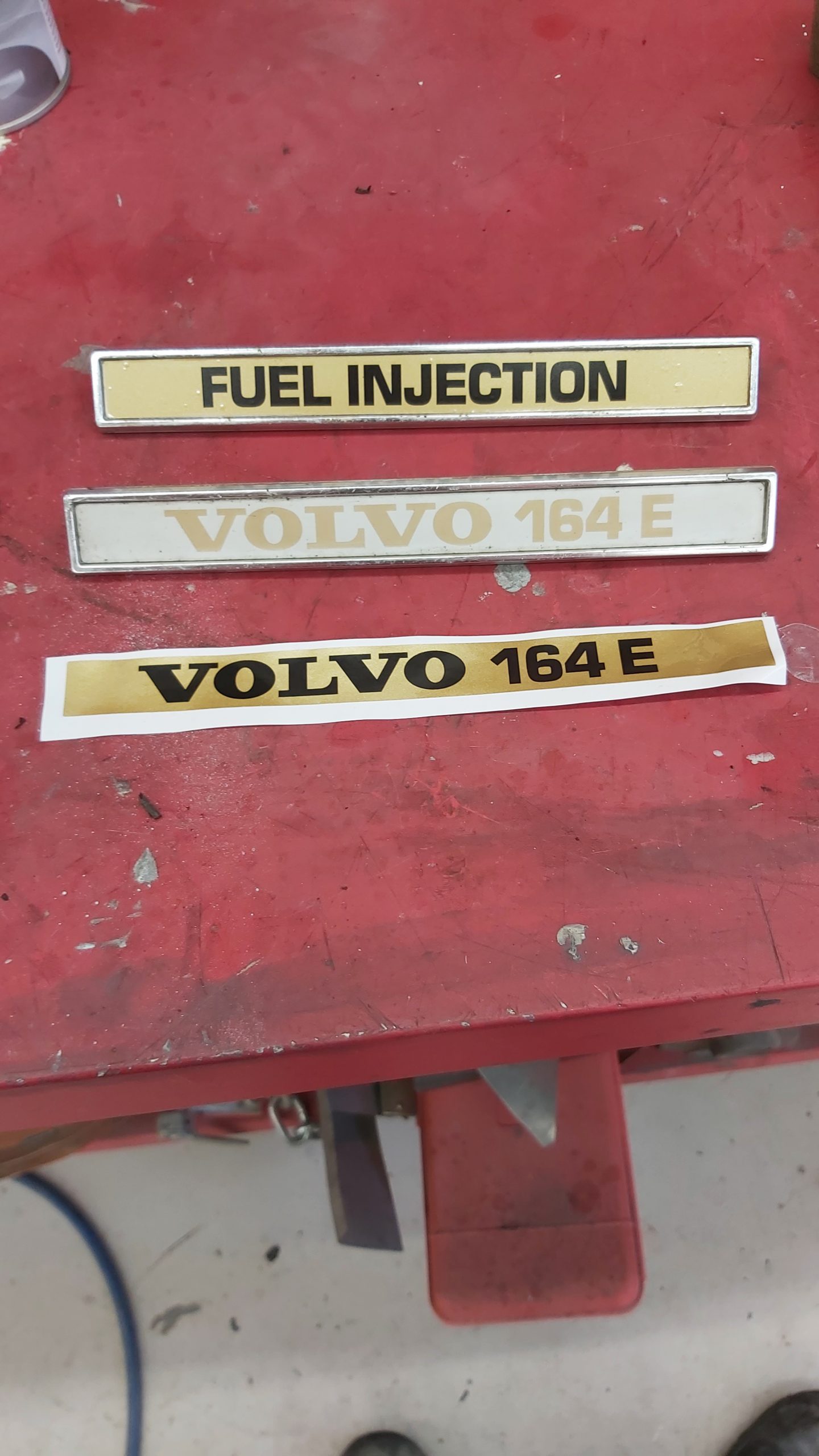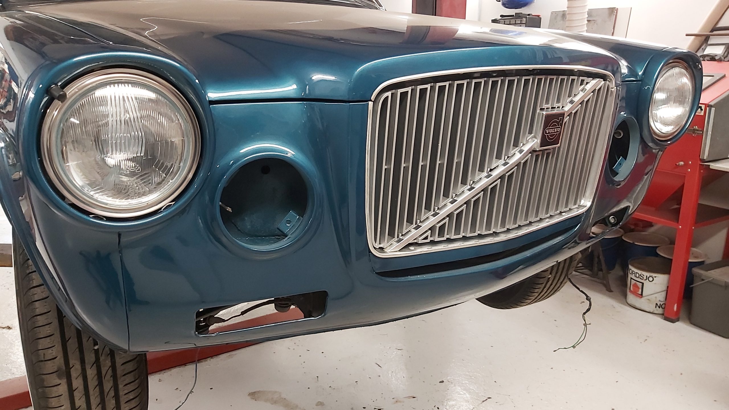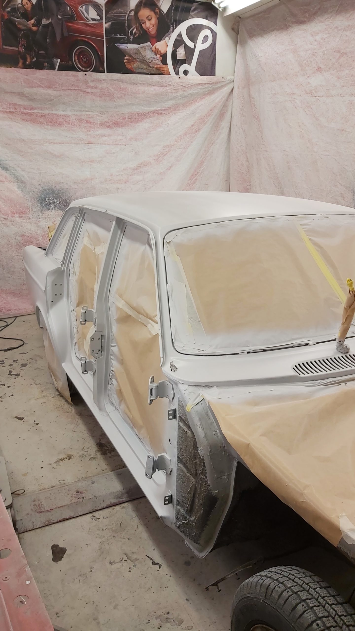 Upptäcker att denna bilen har varit plåtren och omlackad vid ett tidigare tillfälle för många år sedan. Tyckte att det var konstigt att det låg tjock gul grundfärg (sprutspackel) närmast plåten då Volvo använde grå primer. Med det visade sig bla under de limmade blanklisterna på dörrarna där den gamla primern fanns kvar där.