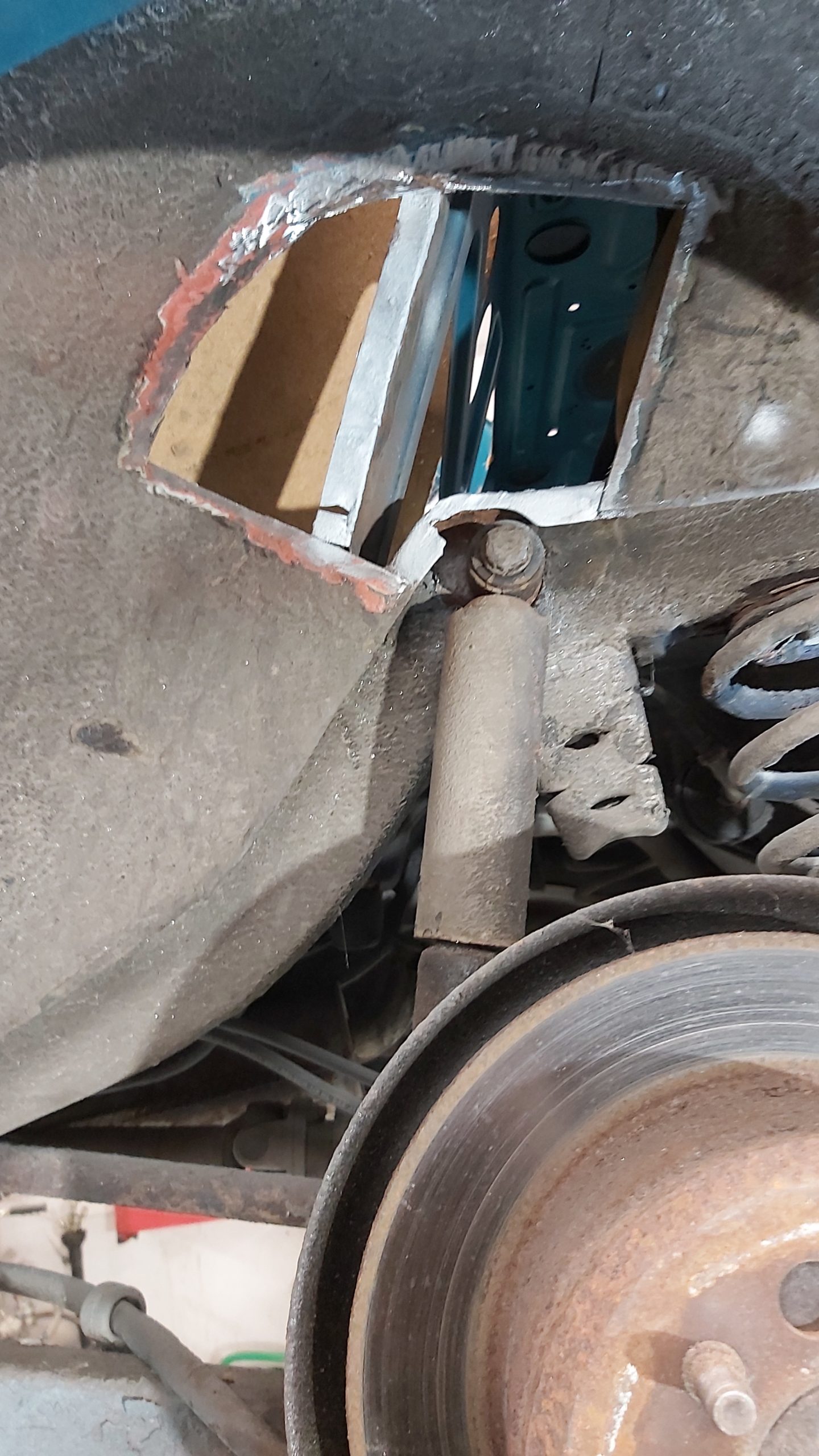 Vänster stötdämparförstärkning är dålig och byts ut.
