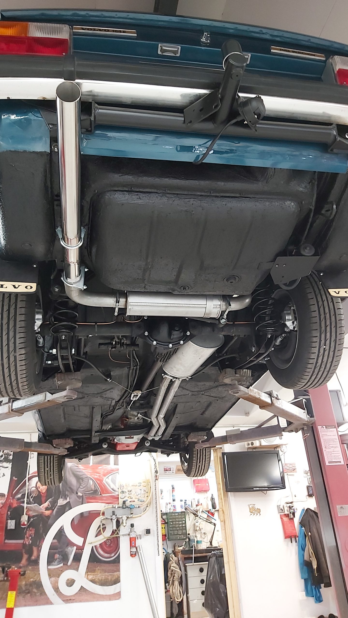 Det främre dubbla avgassystemet är original och resten är byggt i 2,5″ rör med en lite kortare ljud dämpare för att få till ett gött ljud.